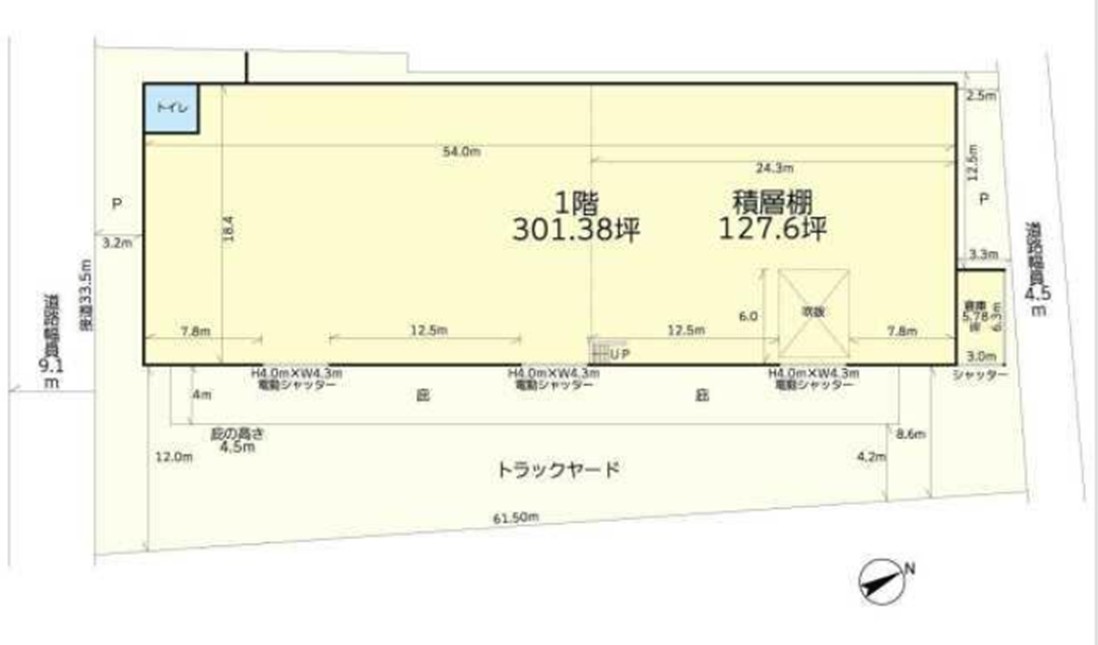倉庫:1階301.38坪、積層棚127.6坪 |