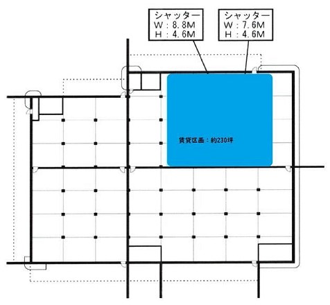 | 備考 | 2階建1階部分の一部 トイレ 電動シャッター(W=8.8m×H=4.6m)1ヶ所 電動シャッター(W=8.8m×H=4.6m)1ヶ所 大型車進入可 |
