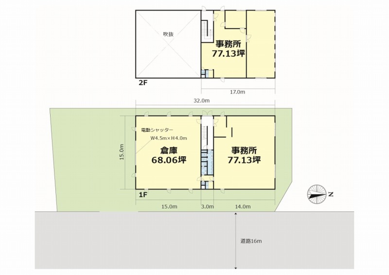 倉庫:68.06坪 事務所:1階:77.13坪 2階:77.13坪 |