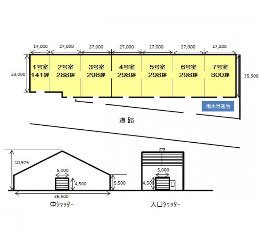 | 備考 | 1号室 141坪 2号室288坪 3号室 298坪 4号室298坪 5号室 298坪 6号室298坪 7号室 300坪 |