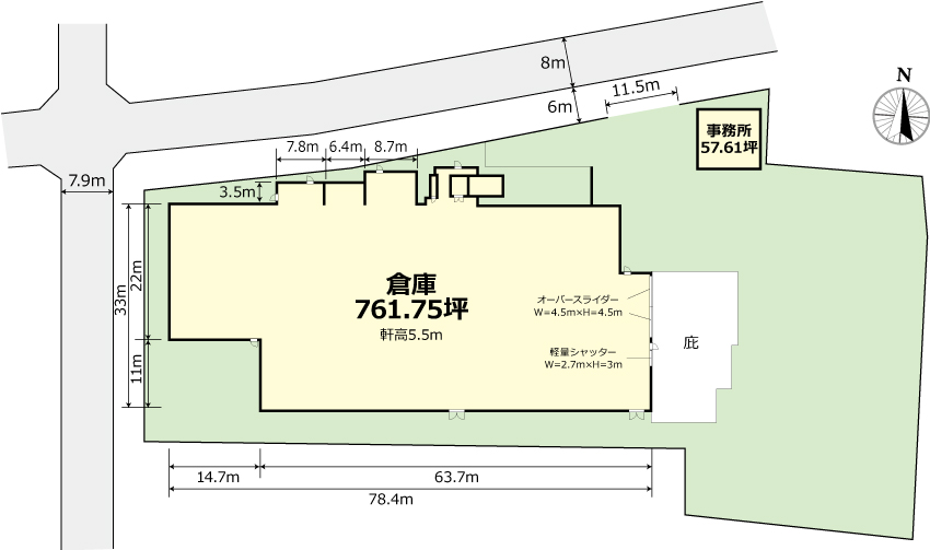 倉庫:761.75坪 事務所:1階29.58坪 2階28.03坪 |