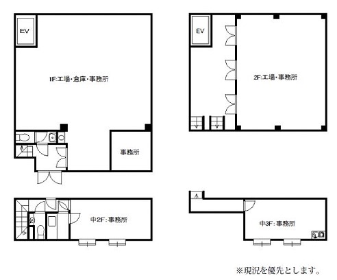 倉庫:1階32.63坪 2階31.94坪 事務所:中2階6.78坪 中3階5.86坪 |