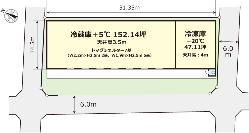 | 備考 | 冷凍庫+5℃:152.14坪、冷凍庫-20℃:47.11坪 ドッグシェルター7基(W2.2m×H2.5m 2基、W1.9m×H2.5m 5基) 高床式倉庫(1m) |