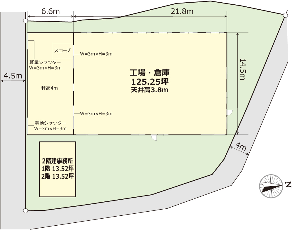 倉庫:125.25坪 事務所:1階13.52坪 2階13.52坪 |
