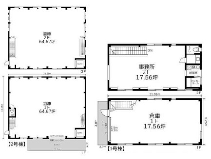 倉庫:1号棟:1階17.56坪 2号棟:1・2階各64.67坪 事務所:1号棟:2階17.56坪 |