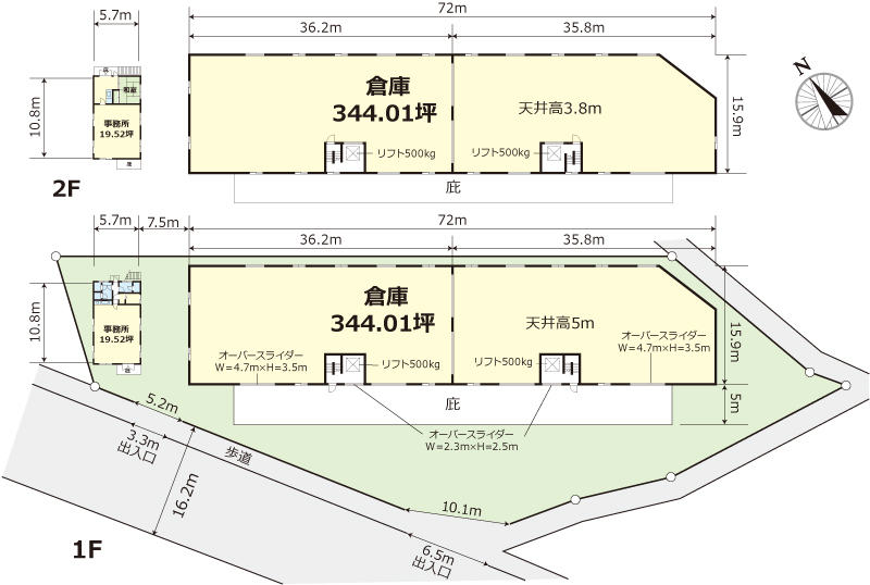 倉庫:1・2階各344.01坪 事務所:1・2階各19.52坪 |