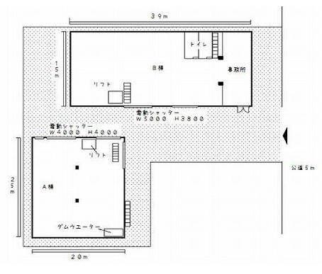 倉庫:A棟1・2階各149.61坪 B棟176.96坪 |
