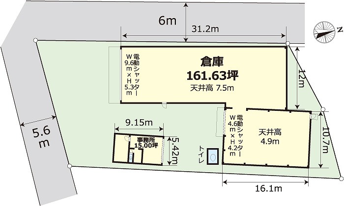 | 備考 | 電動シャッター2ヶ所(W9.6m×H5.3m、H4.6m×H4.2m) クレーン3基(2.8t) トイレ2ヵ所 天井高:4.9m~7.5m 武蔵野線「越谷レイクタウン駅」徒歩15分 東京外環自動車道「外環三郷IC」5.0km |