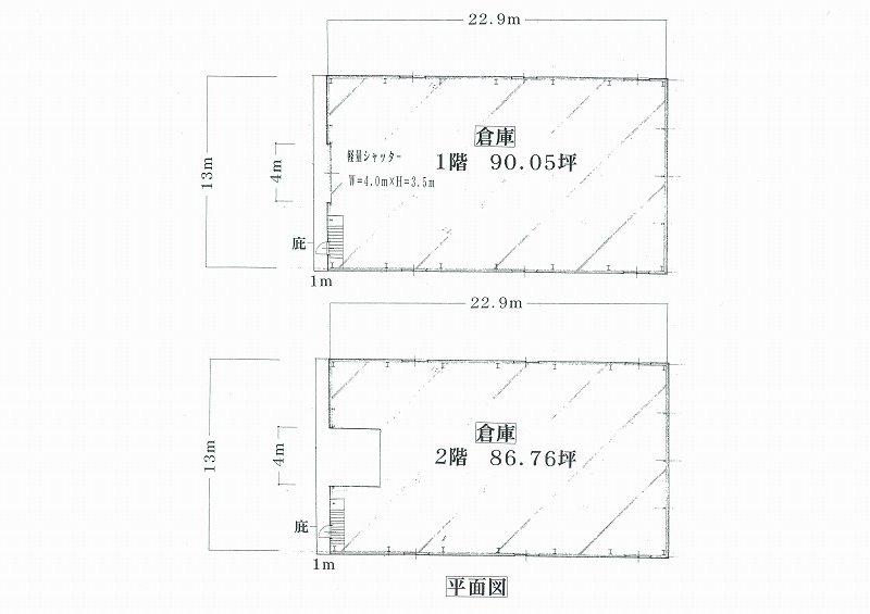 倉庫:1階90.05坪、中2階86.76坪 |
