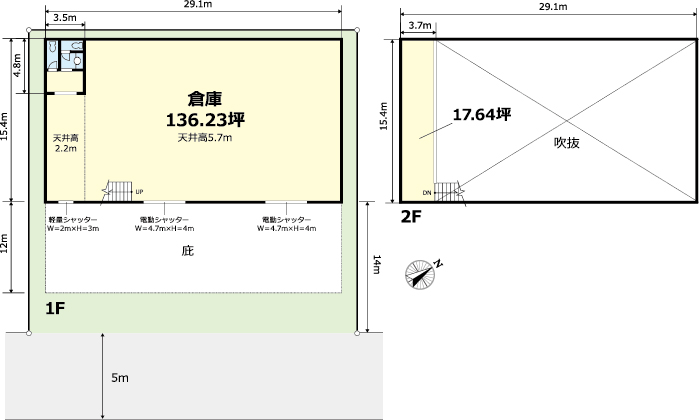 | 備考 | 天井高5.7m 電動シャッター(W=4.7m×H=4m)2ヶ所 軽量シャッター(W=2m×H=3m)1ヶ所 |