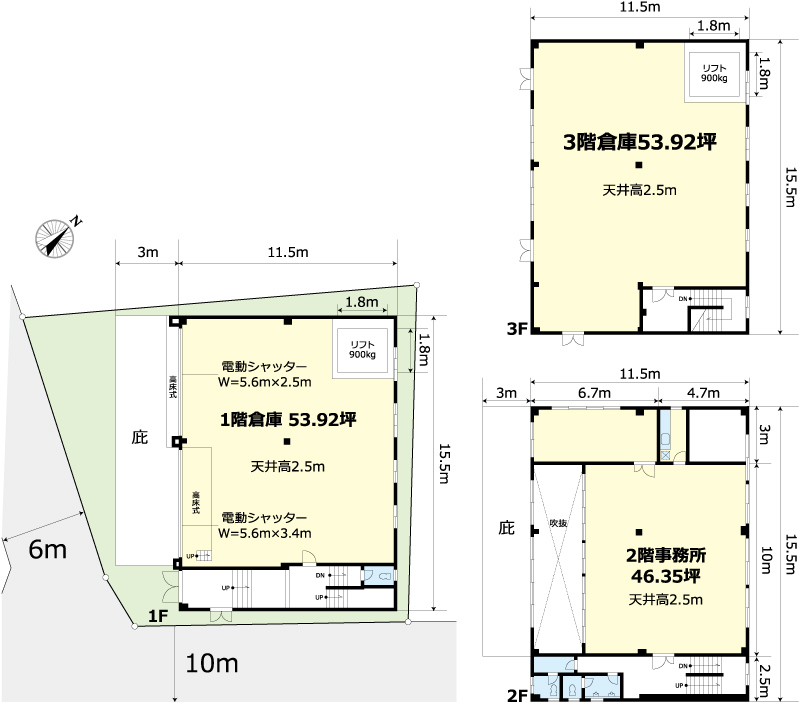 | 備考 | 電動シャッター (W=5.6m×H=2.5m)(W=5.6m×H=3.4m)各1ヶ所 リフト900kg(W=1.8m×D=1.8m×H=1.8m) 高床式90cm |