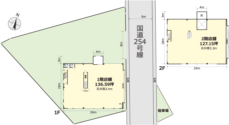 倉庫:店舗:1階136.59坪 2階127.15坪 |