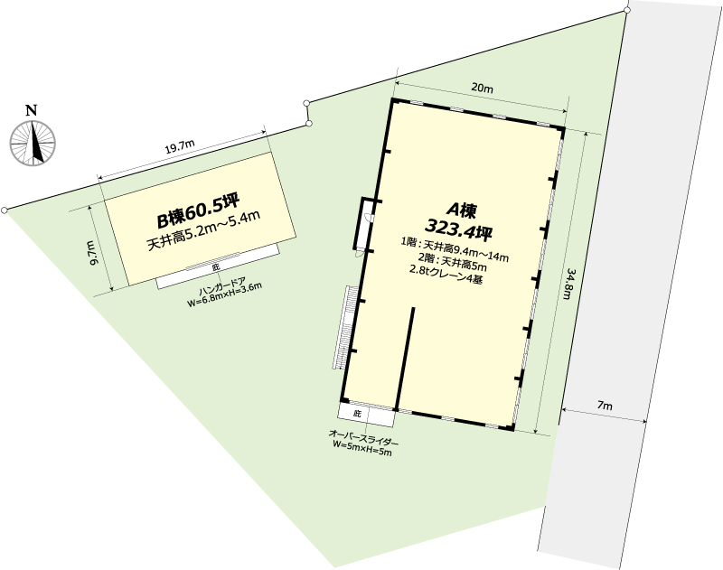 | 備考 | A棟:天井高1階9.4m~14m 2階5m 2.8tクレーン4基付 B棟:天井高5.2~5.4m |