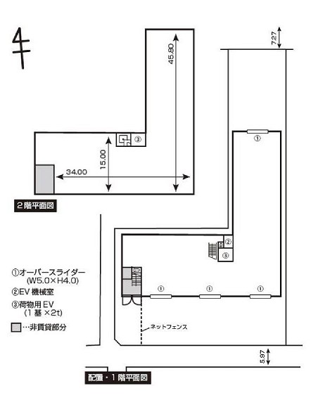 | 備考 | トイレ、荷物用エレベーター2t1基 オーバースライダー(W=5m×H=4m)3ヶ所 |